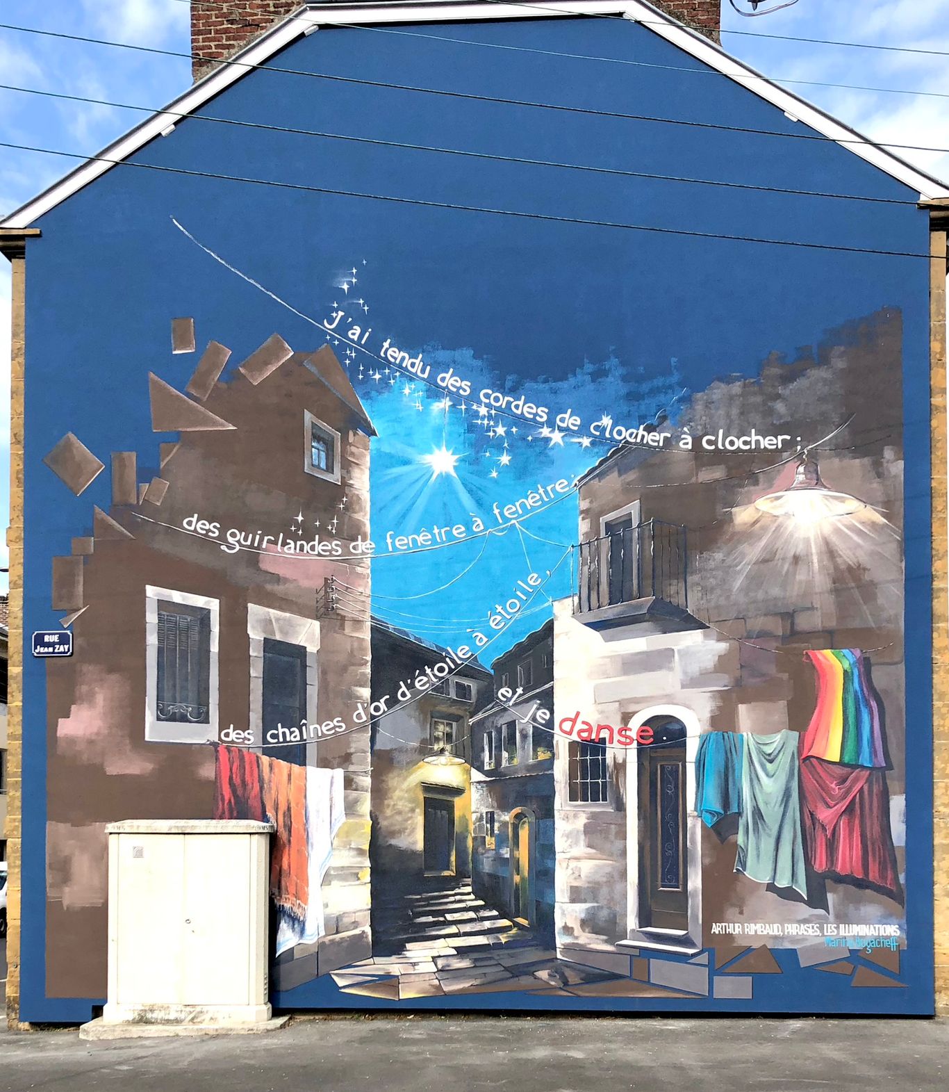 Since 2015, the the Museum of Arthur Rimbaud in Charleville-Mézières has commissioned artists to create urban artworks on the city's walls. These works, combining text and illustration, are intended for the general public and highlight Rimbaud’s work without the barrier of books or museums.